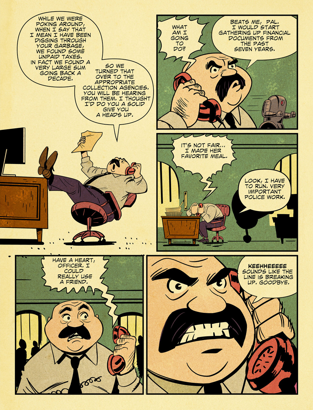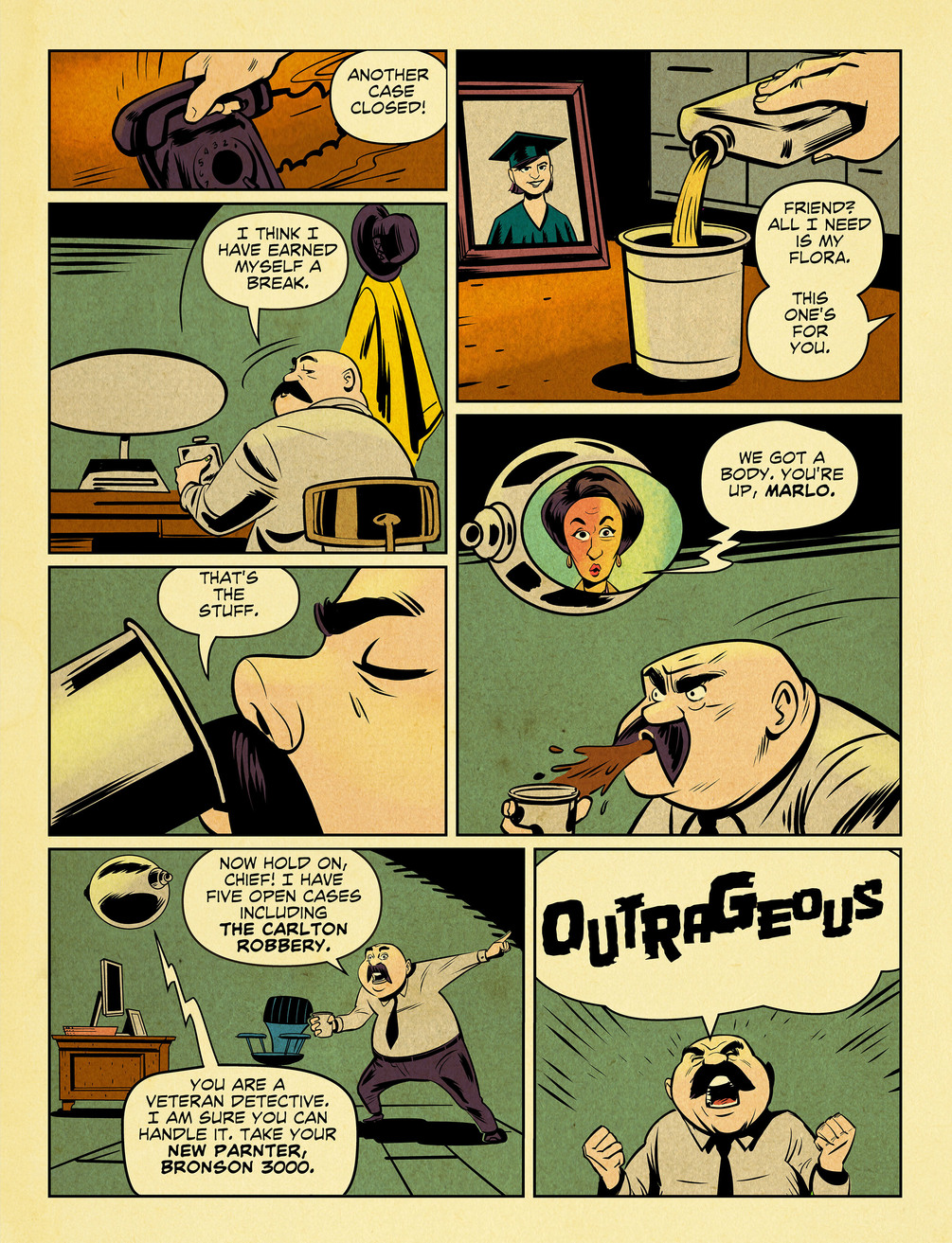 Detective Cobalt is a comedic noir sci Fi adventure comic set in a not so distant future. When a high profile member of Iron City Society is murdered, Detective Cobalt is partnered with a robot (Bronson Bot 3000) to investigate. Cobalt must set aside his anger and resentment of artificial Intelligence in order to solve this heinous crime.